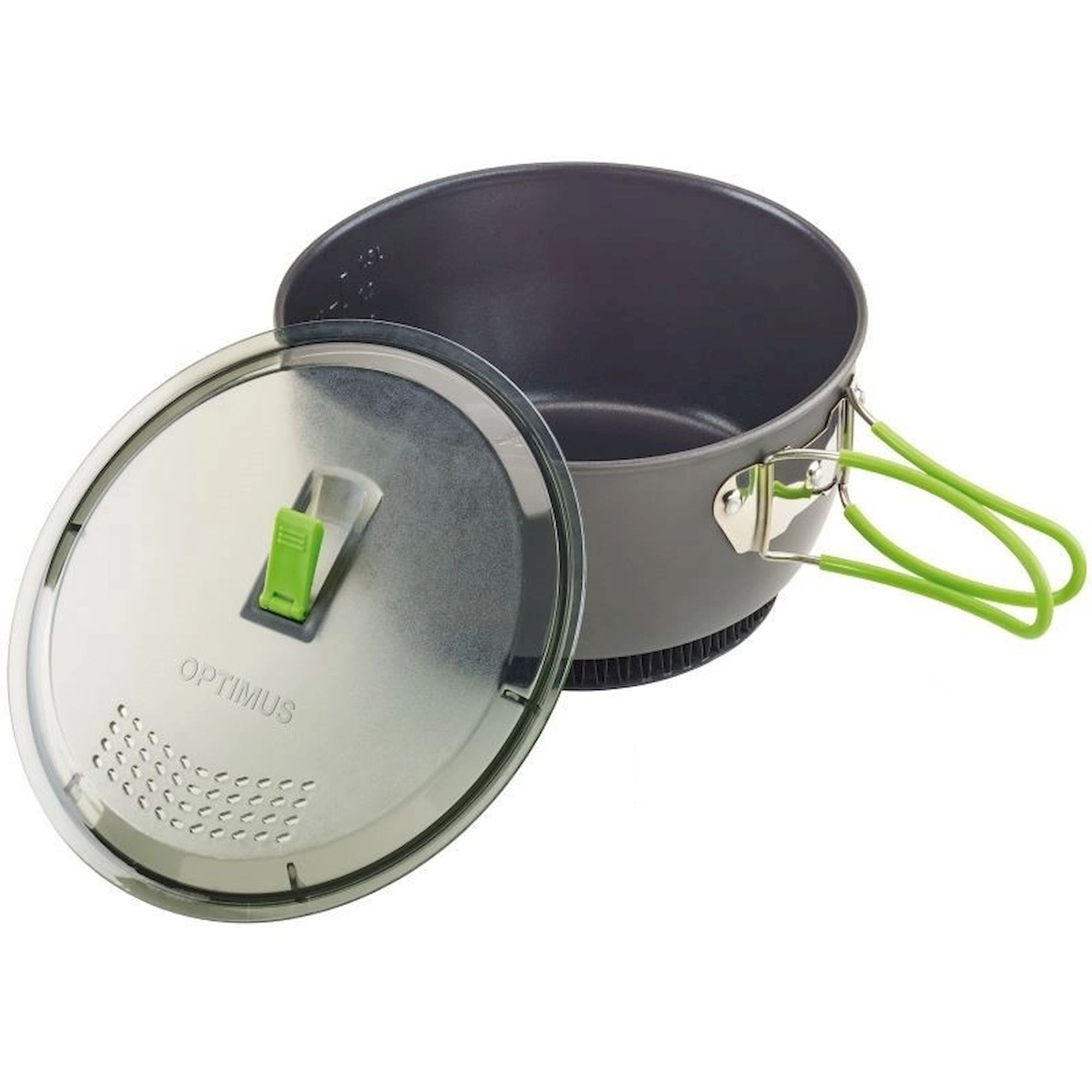 Om licht te reizen en goed uitgerust te zijn, biedt Optimus u de Terra Xpress HE Kookset aan. Dankzij de hoogrenderende HE-warmtewisselaar onder de pan, wordt de kooktijd met 30% verminderd, terwijl er aanzienlijke brandstofbesparingen worden gerealiseerd. De Terra Xpress HE bestaat uit twee onderdelen: een gegradueerde antiaanbakpan en een transparant deksel dat ook als vergiet kan dienen. De meegeleverde mesh-draagtas biedt ruimte voor titanium bestek en elke Optimus brander om de ruimte in uw tas te optimaliseren. Makkelijk te vervoeren, compact en met een inhoud van 1,75 L, u zult uw tas niet meer kunnen inpakken zonder uw Terra Xpress HE Kookset!