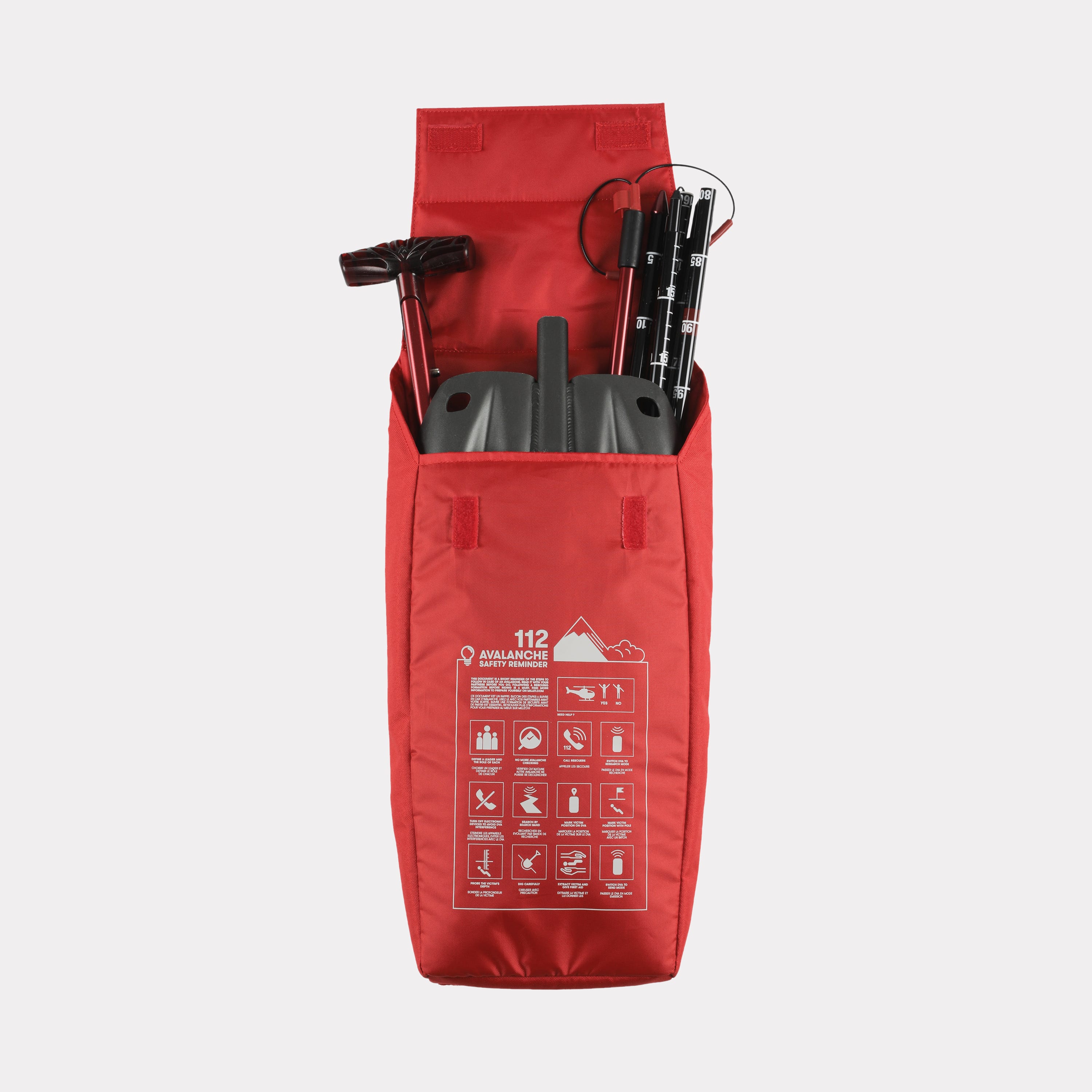 De Safety Pocket is een veiligheidszak die kan worden verwijderd, ontworpen door Millet om u te helpen uw veiligheidsuitrusting op te bergen. Schep, sonde, EHBO-kit, u kunt uw essentiële spullen erin opbergen. De Safety Pocket is niet zomaar een opbergzak, het is ook een echt geheugensteuntje tijdens lawinesituaties. Aan de buitenkant van het zakje vindt u een herinnering aan de 12 stappen die u moet volgen. Een waardevolle hulp om uw kalmte te bewaren.