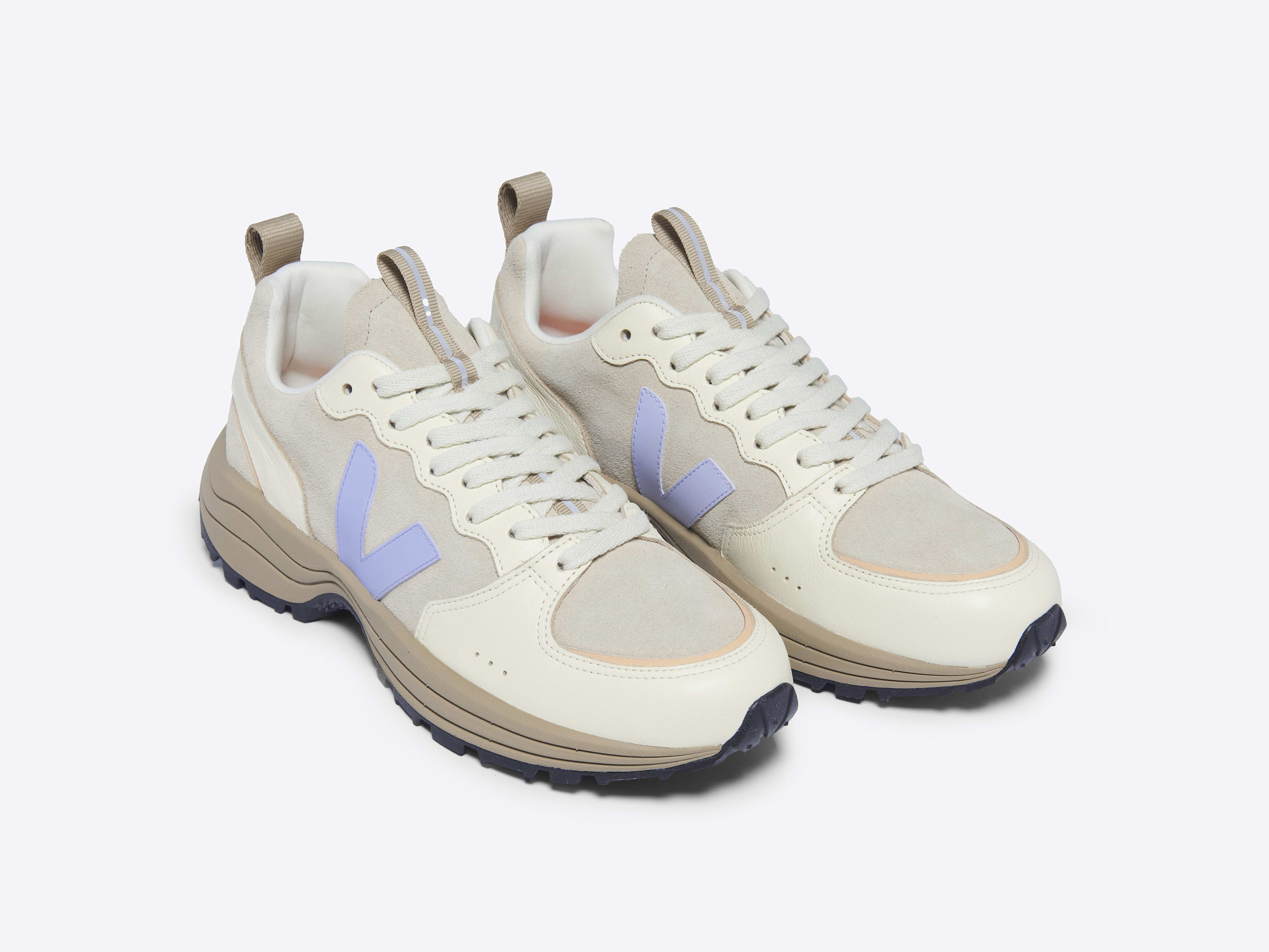 Het kenmerkende V-logo is gemaakt van een mix van Amazonerubber, minerale silica en synthetisch rubber, wat Veja's inzet voor duurzame materialen illustreert. Binnenin combineert de zool Amazonerubber, bio-gebaseerde E.V.A. afkomstig van suikerriet, gerecycled E.V.A. en biologisch katoen, wat zorgt voor optimaal comfort en demping bij elke stap. De tussenzool, ontworpen met een hoog gehalte aan bio-gebaseerde E.V.A., bevordert goede ondersteuning en beperkt de milieu-impact.